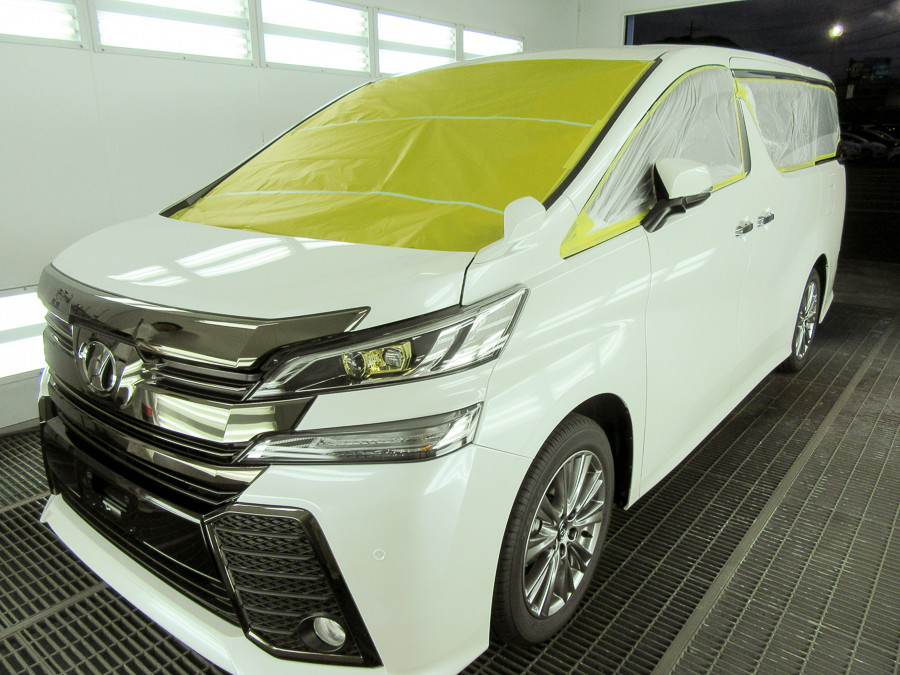 マスキング作業はガラスのみ行い、特にフロントガラス部は細心の注意をはらいます。 コーティングは樹脂、メッキ部、ホイールにも施工できるためマスキングは不要です。